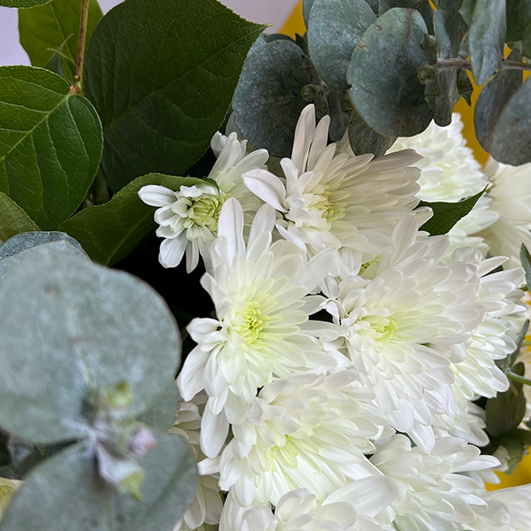 The daisy chrysanthemums are a symbol of innocence and purity, while the eucalyptus is a symbol of strength and endurance. Together, these flowers create a bouquet that is sure to bring peace and tranquility to anyone's home. The bouquet is arranged in a loose and airy way, so that the flowers can be enjoyed to their fullest. Ready to be given as a gift.